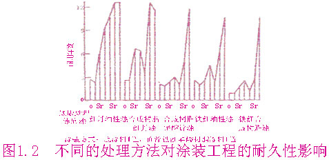 《防锈防蚀涂装技术》一书中阐明钢材表面处理对涂层使用寿命的影响,并以图表示。该实验以五种不同的